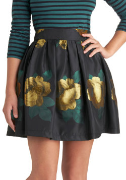 For a fun night out, I found this In the Garden Skirt, which is paired with a teal and black striped shirt, teal suede pumps, a black clutch and gold accents.