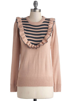 Finally, for something feminine and frilly, this Professional Pizzazz Sweater caught my eye. Pair with a pleated navy skirt and navy tights, some light rosy colored heels and simple navy studs, and you've got an almost nautical look.